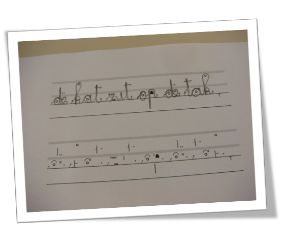 - Het woordbeeld wordt spontaan mee geoefend door het “ontcijferen van de codetaal”.